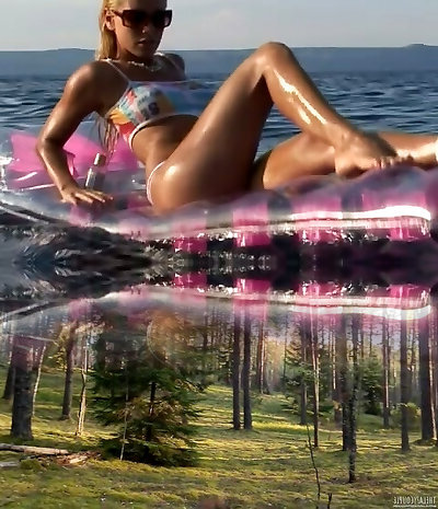 Divine blondie is floating on the lake with her legs wide open