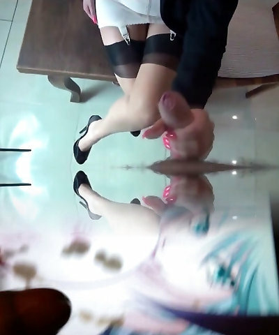 Footjob Shoejob in tigh high overknee leather boots spandex mittens and shiny bodysuit expect you like my tits!