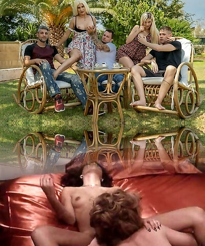 Two sexy brunette honeys are fucked by two shafts on the back yard