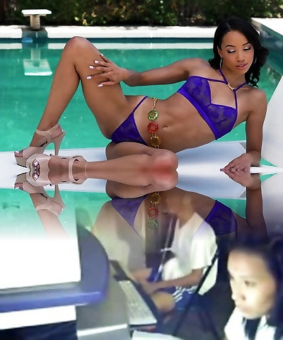 Insatiable dark-hued girl by the pool blowing white dick